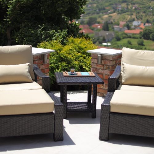 Hagyományos forma. Anyaga rozsdamentes acél és alumínium. időjárásálló kivitel. Borulásgátlóval ellátva, összecsukható.
