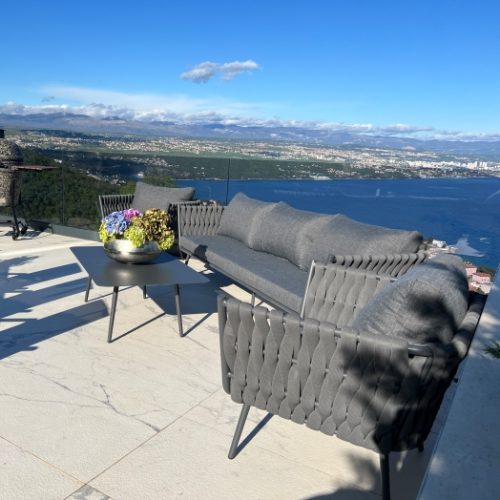 The outdoor sofa set’s cushions have a weatherproof and water-repellent design, they withstand harsh weather conditions, including UV radiation. The elements of the outdoor sofa set can be used separately or as a corner sofa set. The backrest of the set can be adjusted to form a bed.