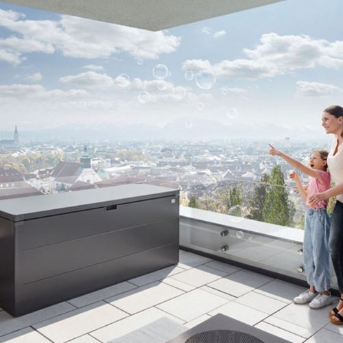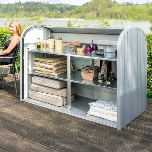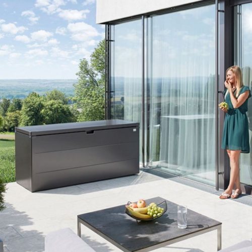 - Könnyes és gyorsan telepíthető időjárásálló fém párnatartó láda amely a legigényesebb épített környezetben is a terasz dísze lehet.