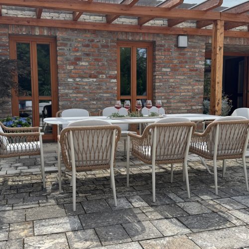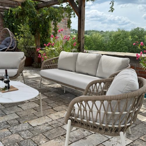 A garnitúra háttámlája kézzel készített, prémium minőségű kötélfonatból készült, amely nemcsak látványos, de rendkívül kényelmes is. A fonat rugalmassága és ergonomikus kialakítása biztosítja a megfelelő alátámasztást, miközben stílusos megjelenést nyújt.